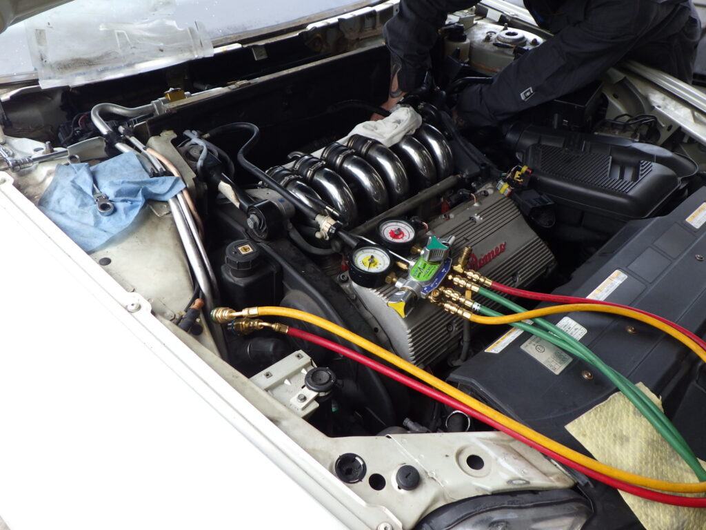 隔壁まで付いてこの時点で、真空引きをしてエアコンのサーキットに漏れがないか確認します。ここならまだ戻ってエバポレーターなどの作業もできないわけじゃありませんから。やりたくないけど(笑)