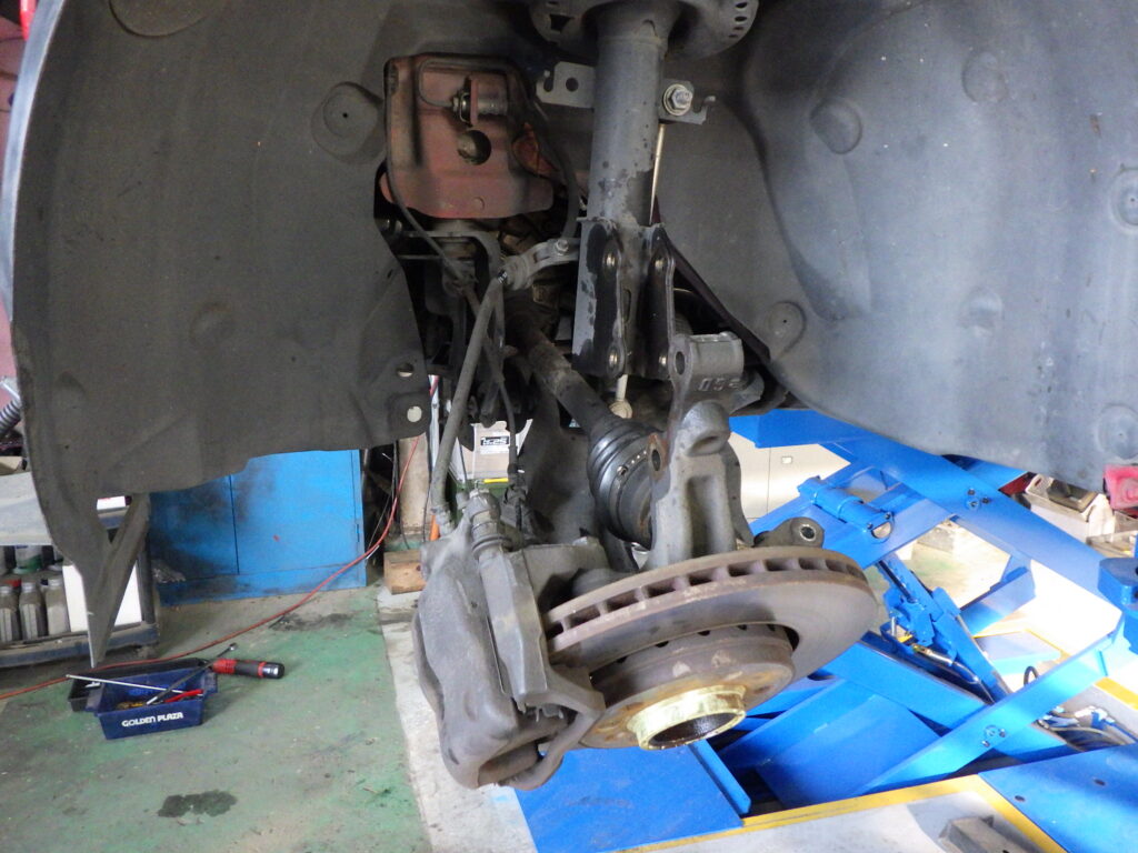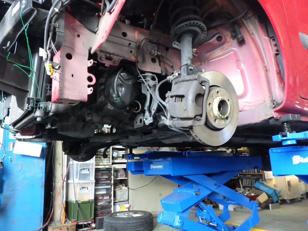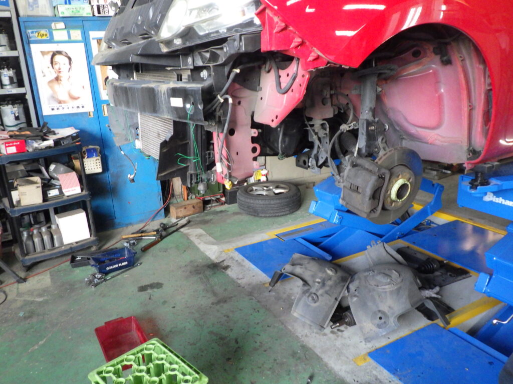 僕らの見立ては、サスペンションクロスメンバーはそのままに、ラジエターの載るフロントクロスメンバーを脱着して作業するというプランです。