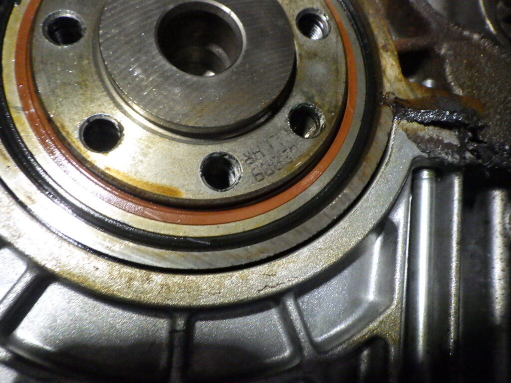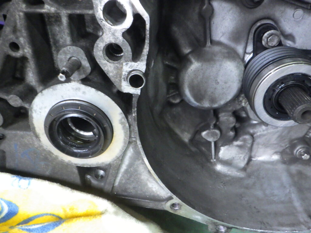 ばーん。ハウジング内は結構汚れていました。ちなみにメインシャフトシールはこの状態で交換できないようです。
