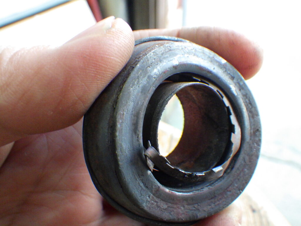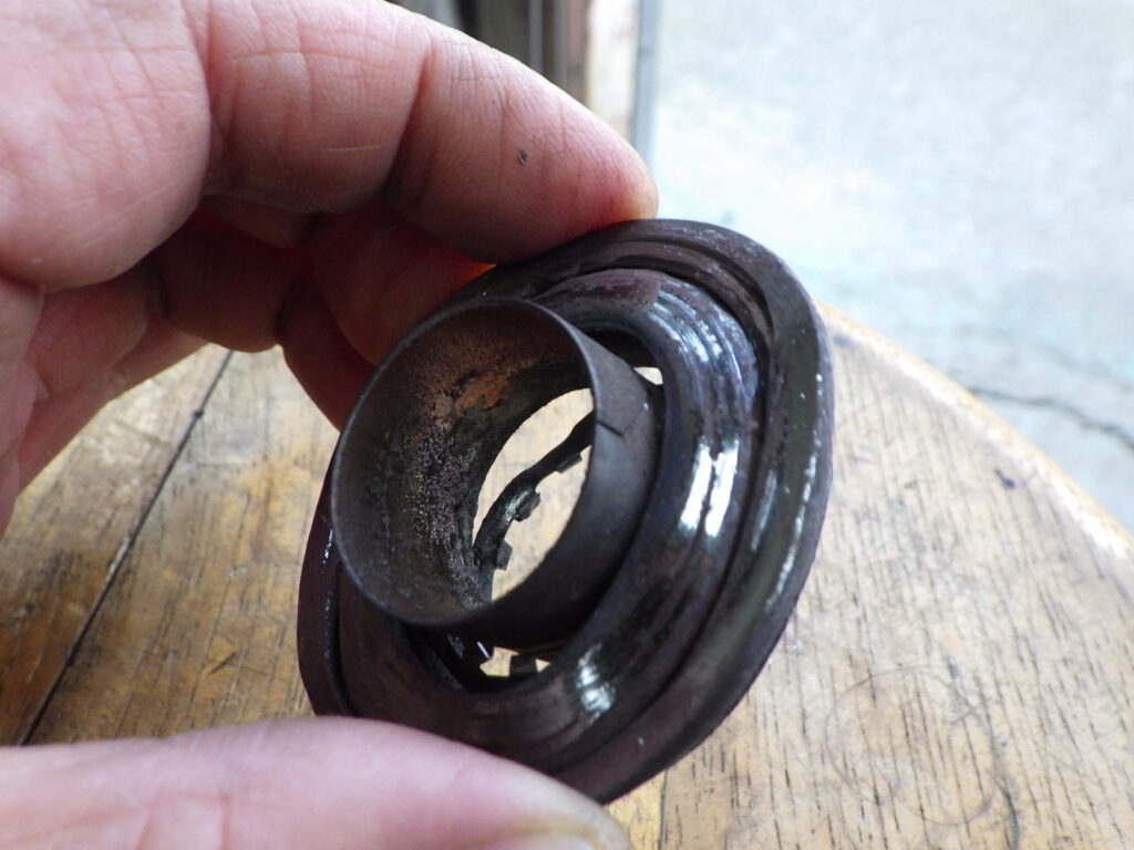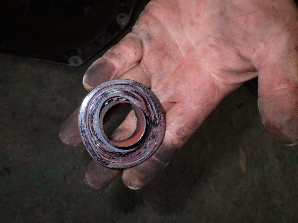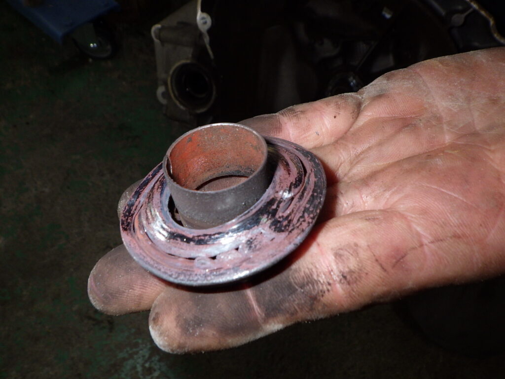 レリーズベアリングのなれの果てです。壮絶な傷み方ですね。ベアリングのボールが溶接されちゃっているのがなんとなく見えます